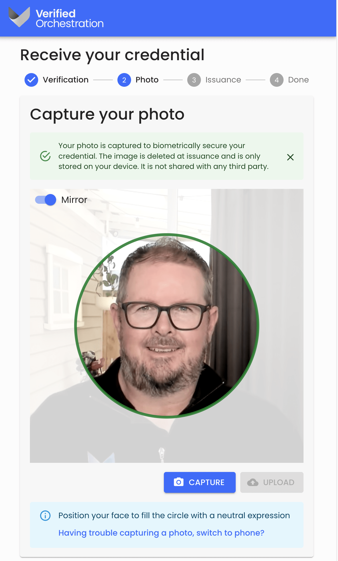 - If the credential requires a Face check photo to be captured, the recipient will be asked to capture their selfie from our photo capture feature in the Concierge.