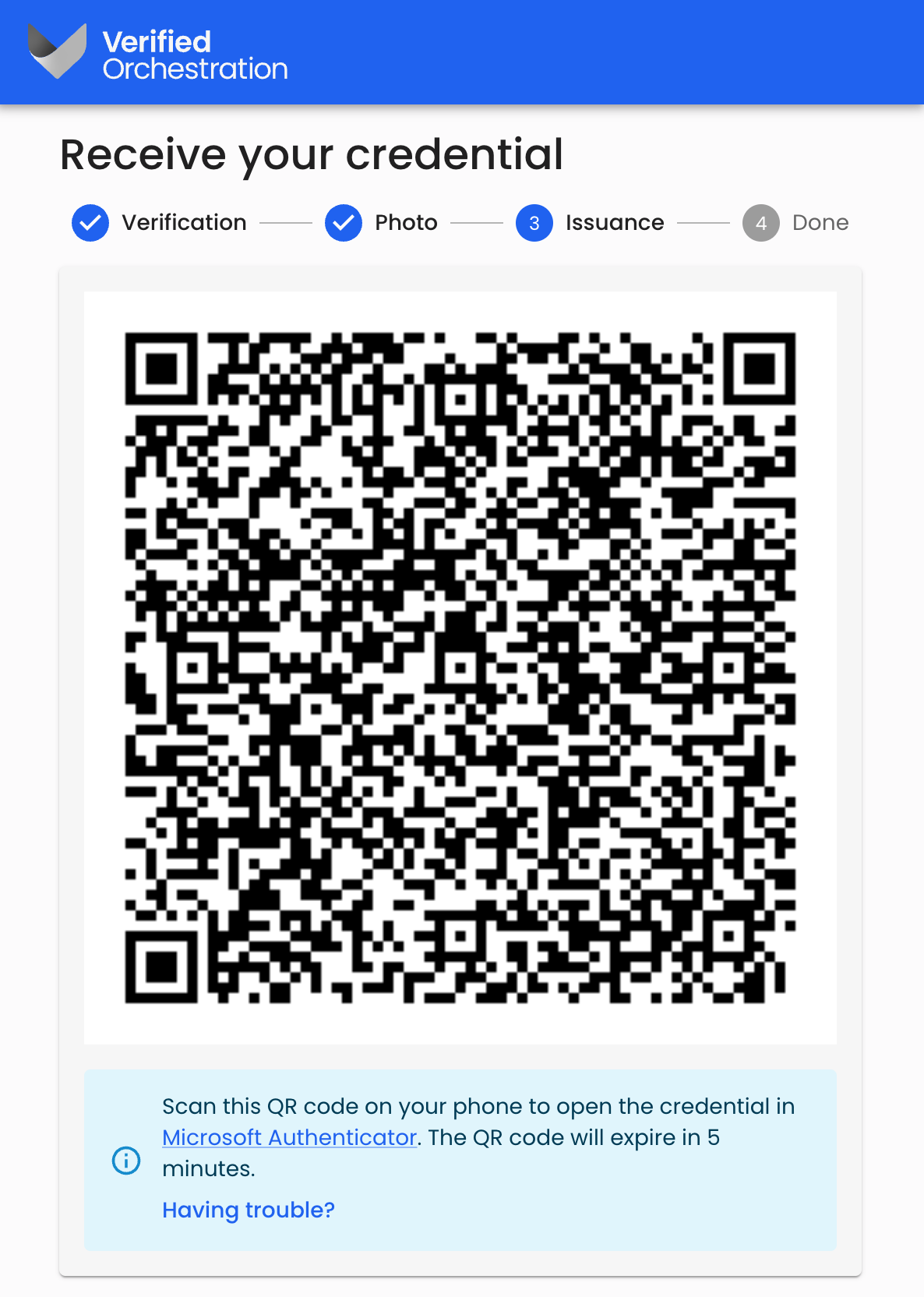 - The final step in the issuance flow is to present the QR code to issue the credential to the recipient’s Microsoft Authenticator app.